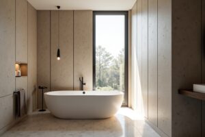 Mineralguss-Wannen bestehen aus einer Mischung aus natürlichen Mineralien und Harzen. Sie sind deutlich schwerer als Acrylwannen und fühlen sich massiv und hochwertig an wie Naturstein. Besonders beliebt sind Modelle in Matt-Optik, die eine sehr moderne und puristische Ästhetik verkörpern. Mineralguss ermöglicht extrem präzise Formen und sehr dünne Wandstärken, was besonders bei freistehenden Wannen für ein filigranes Design sorgt. Zudem speichert das Material die Wärme exzellent, was ausgedehnte Baderituale begünstigt.